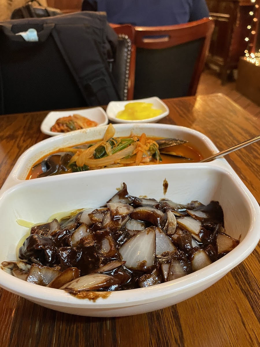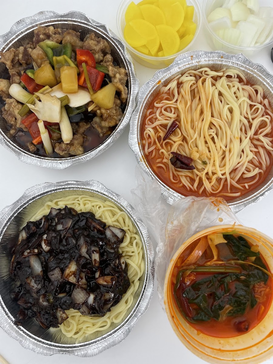 Originally, we planned to go to the restaurant next door, but the wait was way too long, so we ended up coming here instead. The staff greeted customers warmly with big smiles, which was really nice. We ordered the jajangmyeon+sweet and sour pork combo, the jajangmyeon+pork cutlet combo, and the chicken with garlic & pepper sauce. Tbh, the kimchi that came as a side dish wasn’t good at all, so we didn’t have high expectations for the main dishes. However, the jajangmyeon was surprisingly good. The sweet and sour pork was a bit disappointing because the sauce was poured over it, so it wasn’t crispy. The pork cutlet was decent, and the boneless chicken was tasty as well, though the portion was smaller than expected.