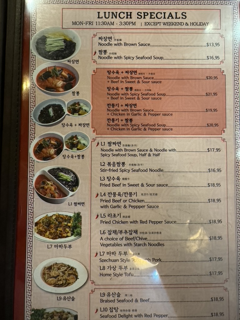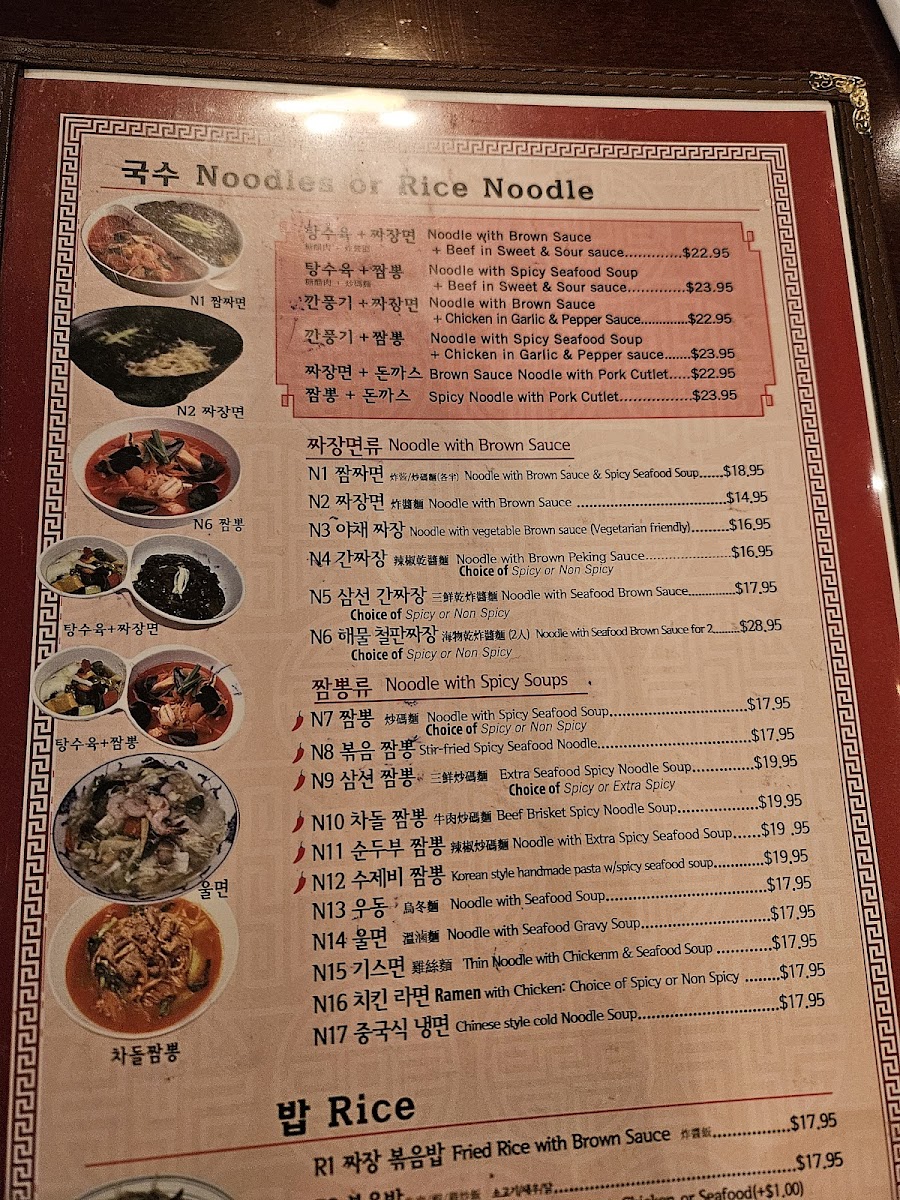 You can expect a variety of noodle dishes like the rich, savory Jajangmyeon (noodles with brown sauce) or the warming, spicy seafood soups such as Jampong and Champon. These classic options pair well with sides like pickles and kimchi, adding familiar textures and tastes that complement the main dishes.